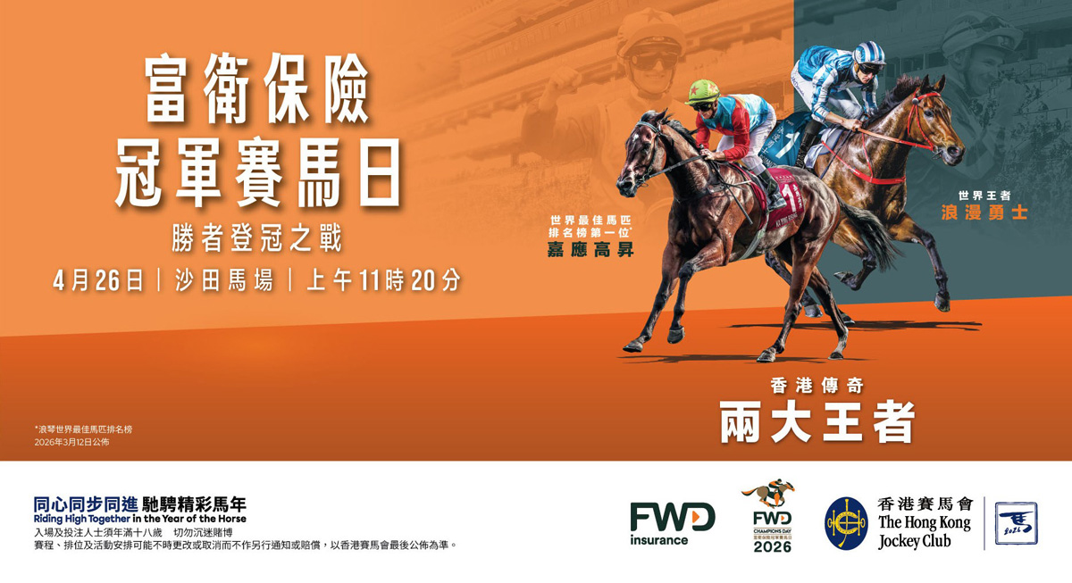 富衛保險冠軍賽馬日「勝者登冠之戰」將於本週日(4 月 26 日)在沙田馬場隆重舉行。今屆富衛保險冠軍賽馬日不但是馬會「馬年系列活動」的重點項目,也是香港每年春季的國際賽馬盛事,雲集全球頂級佳駟,競逐三項世界級一級賽。