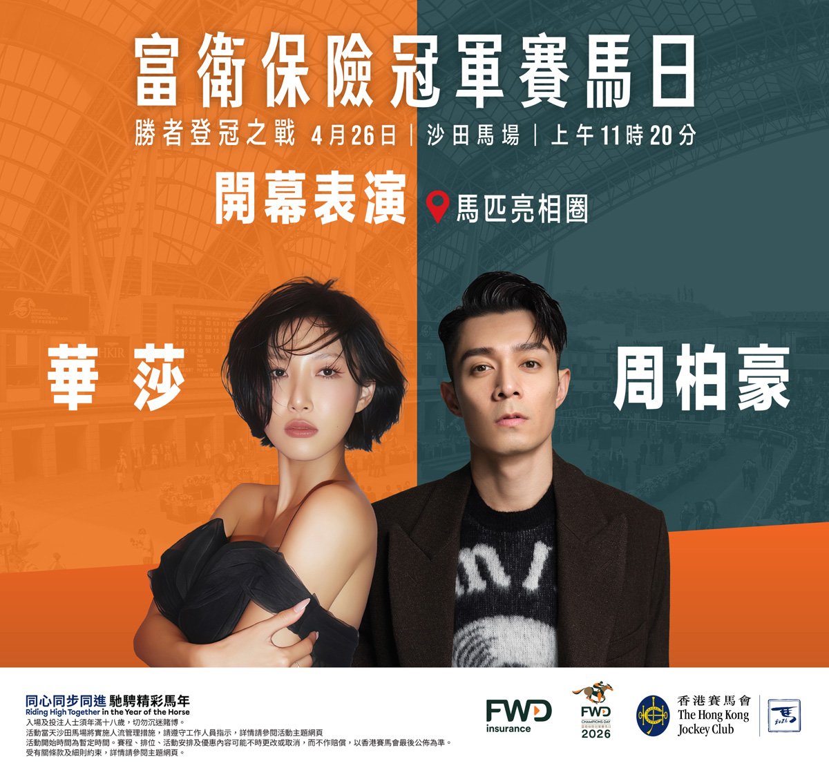 富衛保險冠軍賽馬日將以開幕表演揭開序幕。韓流實力歌手華莎(HWASA)與著名歌手周柏豪將首次蒞臨沙田馬場獻唱。開幕表演將於上午 11 時 20 分在馬匹亮相圈舉行。#