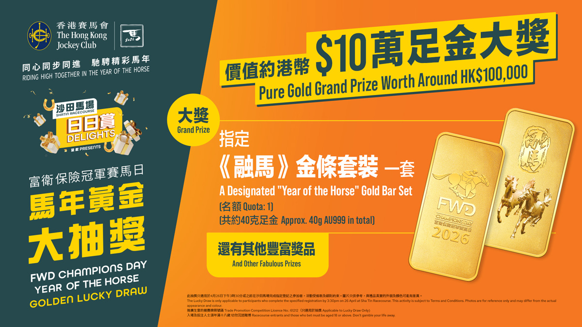 沙田馬場入場人士參加「2026 富衛保險冠軍賽馬日 - 馬年黃金大抽獎」,即有機會贏取大獎價值約港幣 $10 萬元的指定《融馬》金條套裝一套(共約 40 克足金),以及其他獎品。參加者只需於當天下午 3 時 30 分或之前,掃描場內指定二維碼並完成指定登記,即可參加抽獎。@