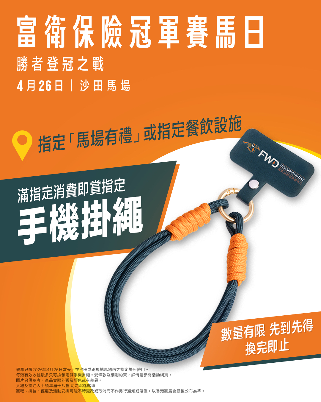 >優惠只限2026年4月26日當天,在沙田或跑馬地馬場內的指定場所使用。每張有效收據最多只可換領兩條手機掛繩。每張換領劵只可換領一條手機掛繩,單一消費最多只可換領兩條手機掛繩。受條款及細則約束。圖片只供參考,產品實際外觀及顏色或有差異。