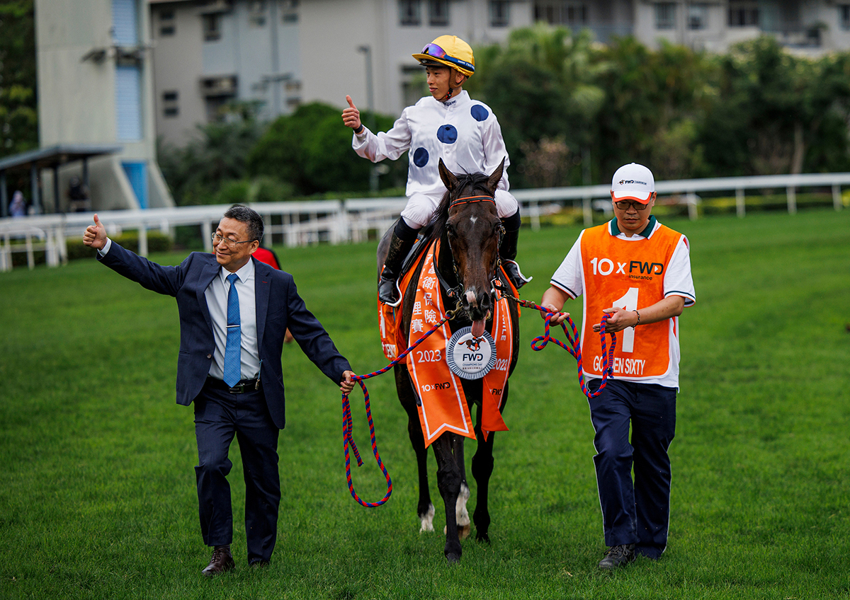 Francis Lui (left) celebrates G1 FWD Champions Mile success with Golden Sixty.