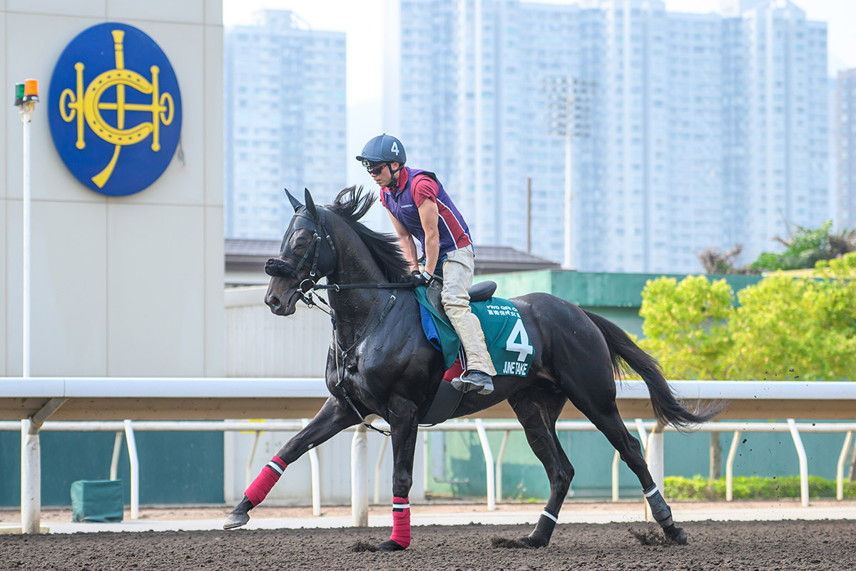 June Take exercised in the trotting ring prior to jogging for a half-lap and hacking for one and a half laps on the all-weather. The horse then got familiar with the parade ring at Sha Tin.