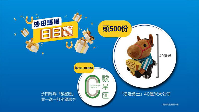 其後第501-1000名可獲沙田馬場「駿星匯」買一送一訂座優惠券一張。