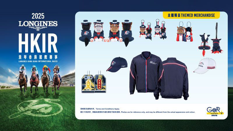 今屆主題賽事精品系列包括:「浪琴香港國際賽事」外套﹑運動帽﹑坐姿毛公仔﹑迷你坐姿毛公仔匙扣﹑999.9黃金工藝精品金章幸運符(約0.2克)﹑摺疊環保手提袋及毛公仔幸運符,一共7款全新賽事精品可供選擇,一眾賽馬愛好者與旅客絕對不能錯過。一起為本地精英打氣,見證世界草地王者誕生!
