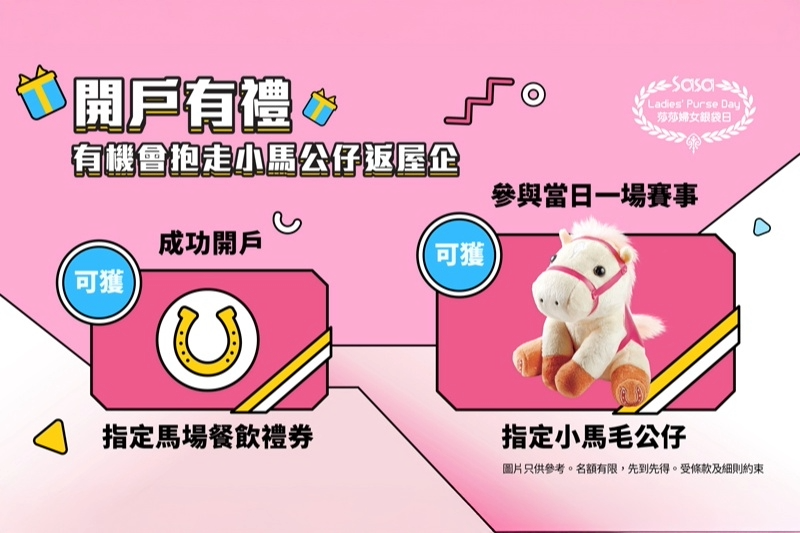 當日於沙田馬場指定開戶專櫃成功開設投注戶口,即可獲指定馬場餐飲禮券;並完成指定活動^,更可額外賞你指定小馬公仔!