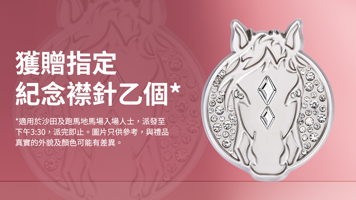 下午3時30分前,沙田及跑馬地馬場入場人士可獲贈指定「紀念襟針」乙個*,數量有限,派完即止。