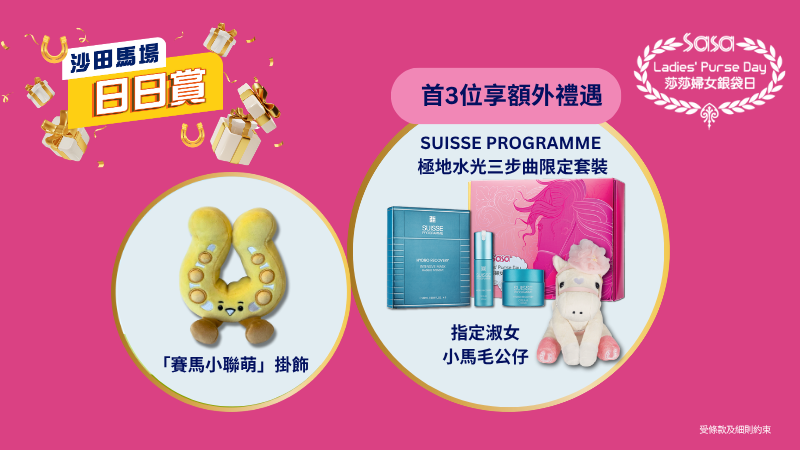 其中首3名最快答中的參加者更可獲莎莎婦女銀袋日形象大使高海寧親筆簽名指定淑女小馬毛公仔及指定SUISSE PROGRAMME 極地水光三步曲限定套裝一份。