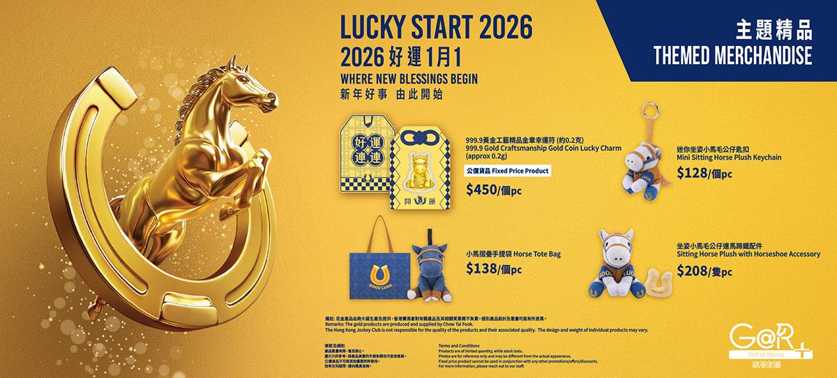 • 「馬場有禮」當天推出多款「2026好運1月1」主題精品並推出指定優惠禮品套裝,詳情可參閲馬場有禮網站。由2026年1月1日至1月31日期間,於「馬場有禮」門店及網店,凡購買任何指定「好運1月1」主題精品,即可獲贈指定襟針一個。+