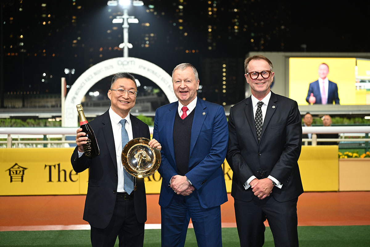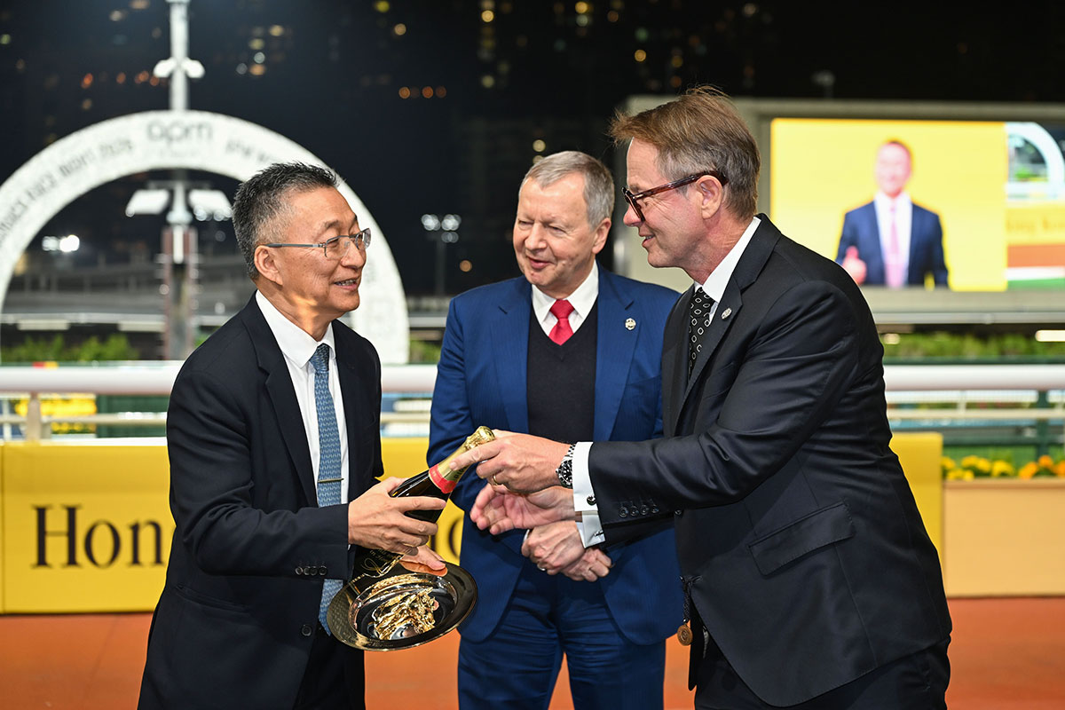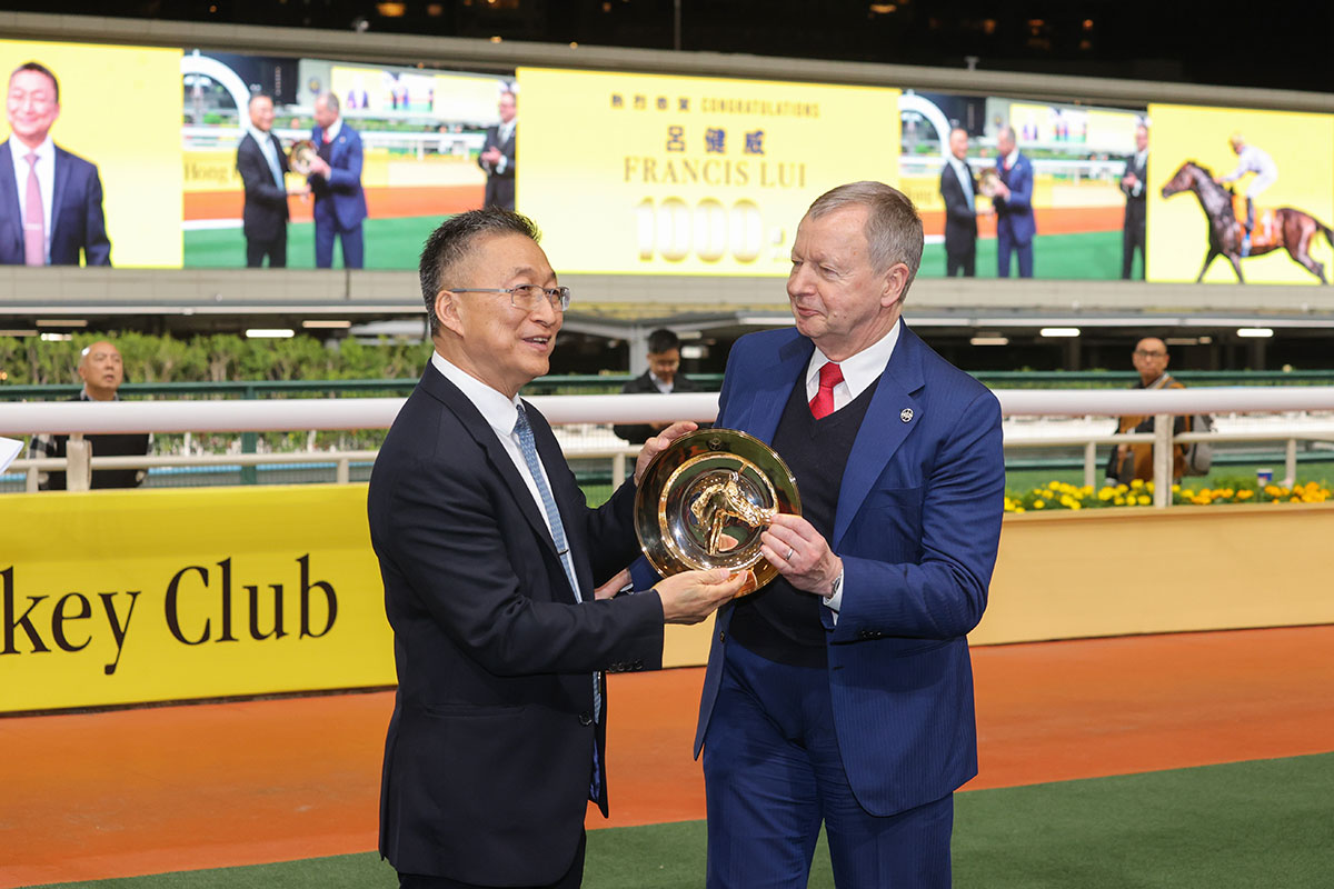 • Trainer Francis Lui reached the 1,000-win milestone in Hong Kong with Speed Dragon in the G3 January Cup (1800m) at Happy Valley tonight (Wednesday, 14 January). Chief Executive Officer, Winfried Engelbrecht-Bresges and Andrew Harding, Executive Director, Racing, The Hong Kong Jockey Club present a gold dish and a bottle of champagne to Francis Lui.
