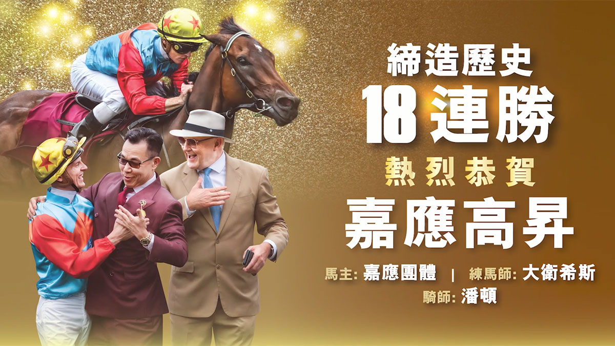 熱門影集 焦點熱話 【2026 女皇銀禧紀念盃】「嘉應高昇」18連勝紀錄 向下滑以查看更多 全部 影片 照片 女皇銀禧紀念盃 賽事重溫 女皇銀禧紀念盃 香港賽馬會「馬年大使」郭富城為「嘉應高昇」打氣支持 「嘉應高昇」18連勝紀錄在望 傳奇共鳴告東尼與高雅志 譚輝智為「嘉應高昇」打氣 嘉應高昇17連勝 體驗嶄新數碼賽馬娛樂 - 天馬驛
