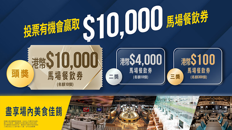 每位各得總值港幣$10,000指定沙田及跑馬地馬場餐飲券