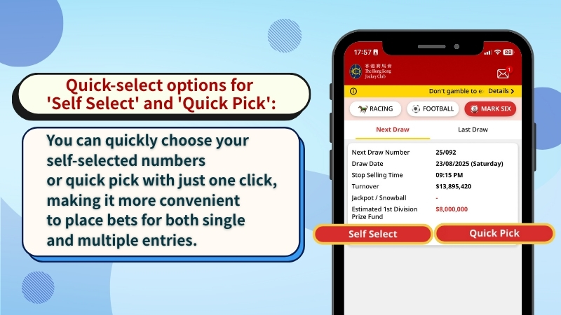 • Quick-select options for 'Self Select' and 'Quick Pick': On the Mark Six main page, you can quickly choose your self-selected numbers or quick pick with just one click, making it more convenient to place bets for both single and multiple entries.