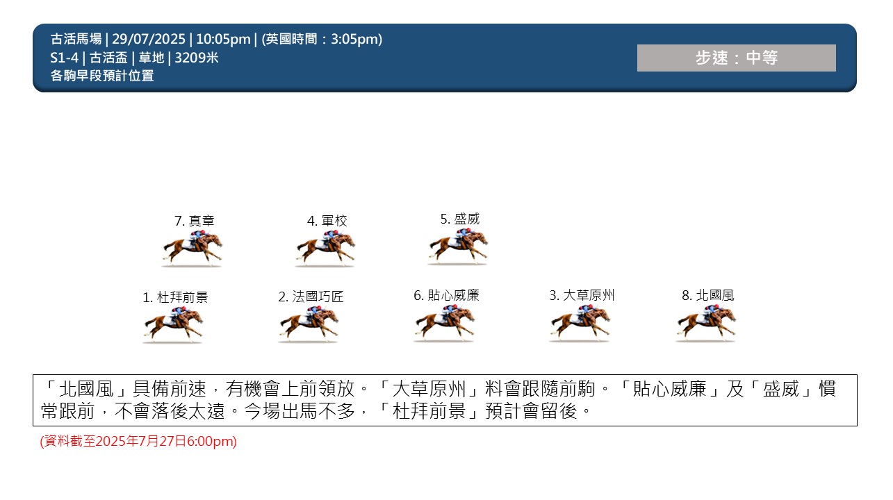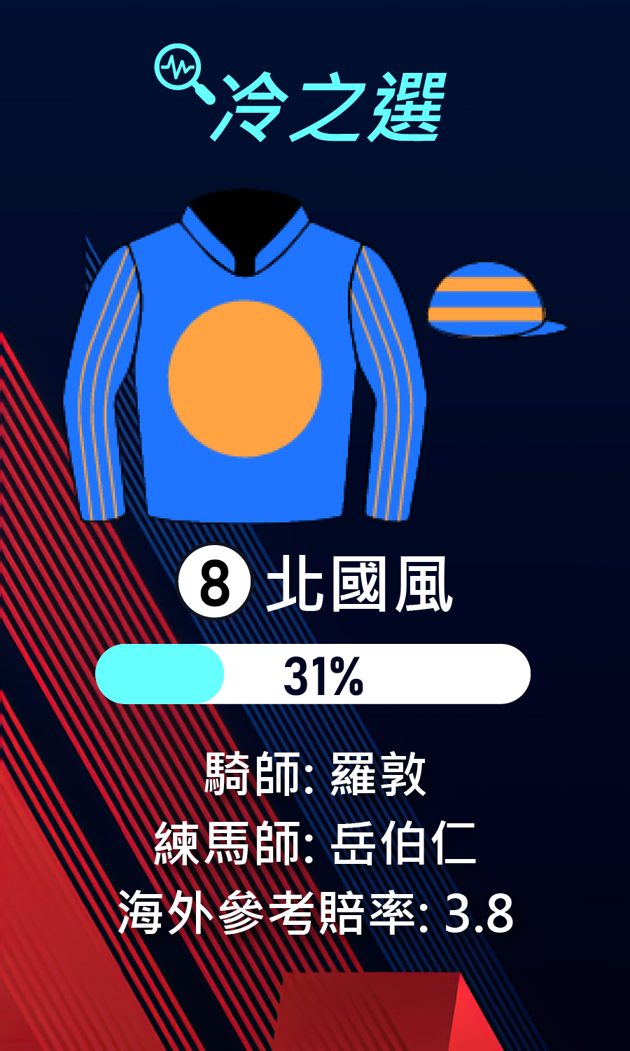 此賽有兩匹戰馬尚未完全展露實力,兩駒均出自我們的馬房。當中「北國風」上仗在新市場的七月賽期演出可人,今次增程角逐兩哩賽事,可望發揮更強威力。「北國風」作為一匹三歲馬,今仗獲分齡讓磅之助,亦屬另一有利因素。上次在皇家雅士谷以佳勢勝出一哩六化朗(2800米)賽事銅馬錦標的「法國巧匠」,同樣值得留意。