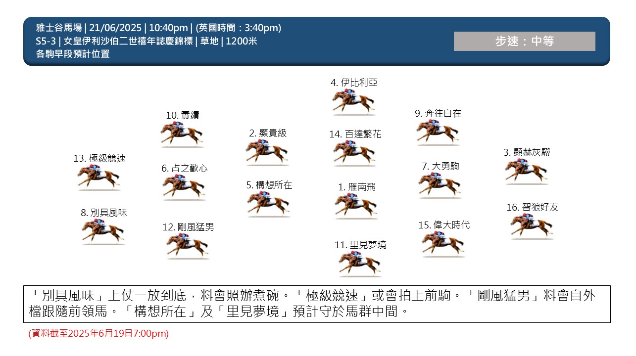 頂級賽駒「別具風味」、「構想所在」及「里見夢境」已確認出戰周六皇家雅士谷賽期壓軸一級賽女皇伊利沙伯二世禧年誌慶錦標。