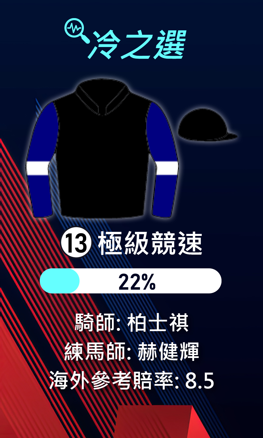 我也十分喜愛「極級競速」這匹短途新晉。去年牠在巴黎隆尚攻下松樹大賽的演出,令我留下深刻印象。上次休後復出牠再在該場獲勝,今賽同樣值得留意。