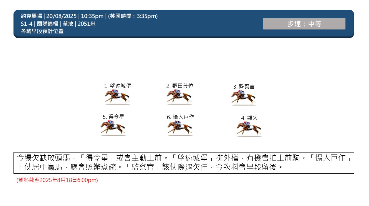 「野田分位」今仗對手實力強勁,當中以「監察官」及「懾人巨作」的威脅最大。「監察官」前仗於皇家雅士谷賽期勝出一級賽,上仗則於7月在沙丘園一項一級賽中僅以短距離之差不敵「懾人巨作」。