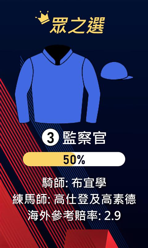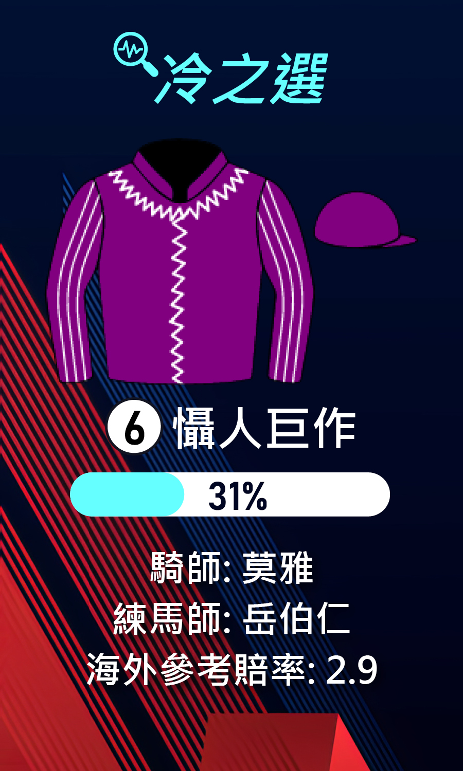 我在此賽中沒有坐騎,假若我可以選騎一駒,我或會選擇夥拍「懾人巨作」出賽。「懾人巨作」與「監察官」繼上仗在日蝕大賽碰頭後,今次將會再度正面交鋒,但我認為前駒的機會或許稍勝一籌。