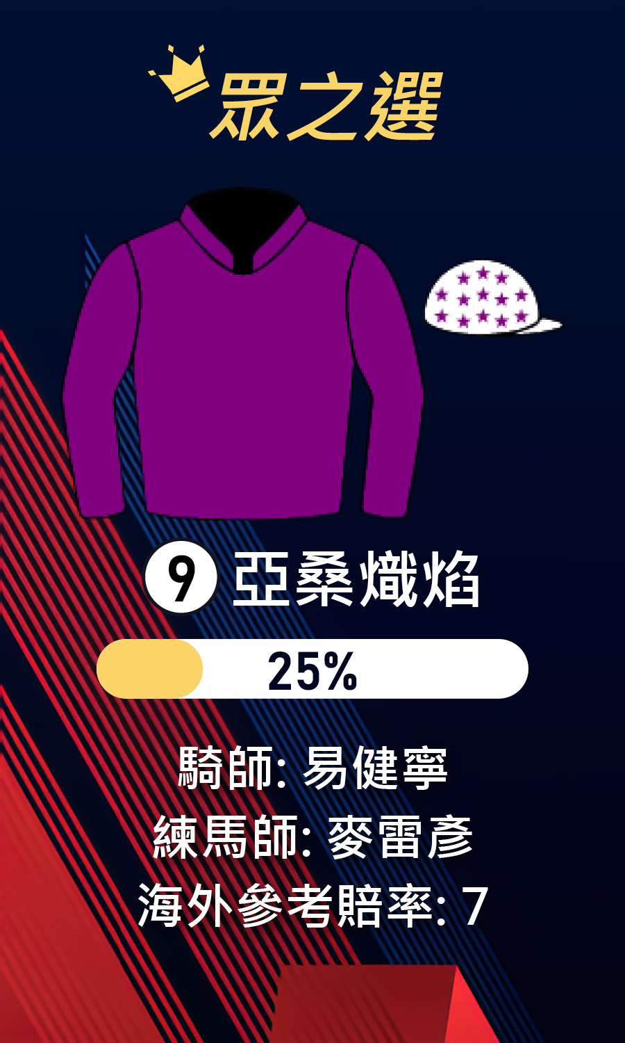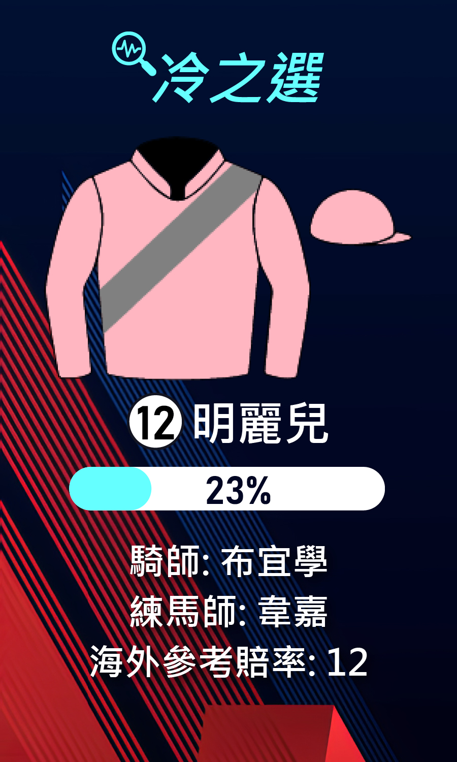 免責聲明: 以上內容及資料僅屬個別作者的個人意見,並不代表香港賽馬會及其附屬公司(“馬會”)的立場。作者提供有關內容及資料以作娛樂用途,而不應被視爲建議任何人作出投注,亦不應被視爲及/或依賴作任何意見。以上內容及資料未經馬會確認、核實或認可。馬會將不對任何人士因使用或依賴以上內容及資料所蒙受的任何損失或損害負上責任,亦不會作出任何賠償。 馬會將不須給予並且不給予任何由以上內容及/其他資料所引起的或與之有關的明示或隱含之保証。馬會特此聲明所載的資料如有任何不確之處、遺漏或誤植錯字,並引致任何直接或間接的損失或虧損,馬會概不負責, 亦不會作出任何賠償(不論根據侵權法、合約或其他規定亦然)。此外,馬會並不保證以上所載的資料乃屬正確無誤及完整無缺,亦不擔保可以及時刊載最新資料, 而且內容適合有關用途。